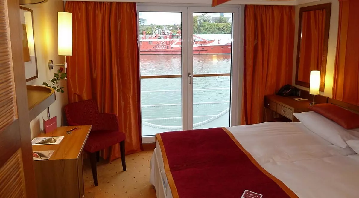 Großzügig geschnittene und komfortable Außenkabine mit französischem Balkon. Elegantes Design und edle Materialien sorgen für Wohlfühlatmosphäre. Ausstattung: Safe, Klimaanlage, TV, Föhn, DU/WC, Saunatuch, Wolldecke, Telefon, Bademantel.