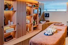 ENTSPANNUNG PUR: Ebenfalls auf Deck 1 ist das extragroße SPA-ROSA mit Sauna, Whirlpool, Eisgrotte, Heat Bench, Ruheraum sowie Anwendungsräumen und Fitness- Area. Auf dem Sonnendeck stehen den Gästen zwei Pools zur Verfügung.
