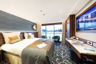 Alle Kabinen liegen außen, sind sehr komfortabel und luxuriös ausgestattet. Auf dem Orion- und Saturndeck mit französischem Balkon. Auf dem Neptundeck mit kleinen Fenstern (nicht zu öffnen).