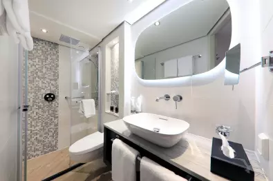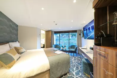 Ausstattung: Dusche/WC, Fön, individuell regulierbare Klimaanlage, SAT-TV (Flachbildschirm), Radio, Minibar, Kaffeemaschine, Safe, Telefon, kleine Tageszeitung. Die Bordspannung liegt bei 230 V Wechselstrom. Die Betten lassen sich wahlweise als Doppel- oder Einzelbetten stellen.